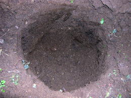 E水が完全に引いたら、残りの土で穴を埋め戻します。時間がたつと凹むので、やや盛り上がる程度に土を入れて手で押さえます。 |