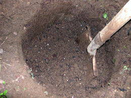 | @直径50cm、深さ50cmくらいの穴を掘ります。苗はCで植えるまでの間は根が乾かないように水に浸けておきます。 |