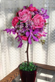 オアシスを丸く切って、バラやカーネーション、ランなどを使ってピンクのトピ