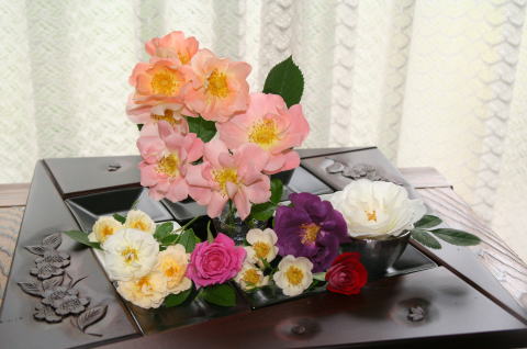 レンチェル・ボウズ・ライアン、浮雲様、ダナエ、淡雪、ミッドナイト・ブルー 他・・・軽井沢彫の盆に