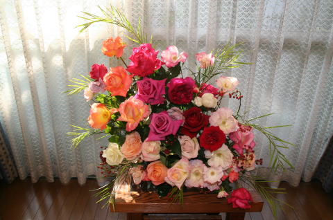 秋らしくオレンジ色に輝くバラとこっくりと濃いピンク色のバラを組み合わせました。なかなか思うように活けることができず、苦労しました。