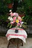 ちょっとエレガントに。生けているときは色合いが淡すぎかなと思いましたが、生け上がって自然光に当ててみると意外に映えました。