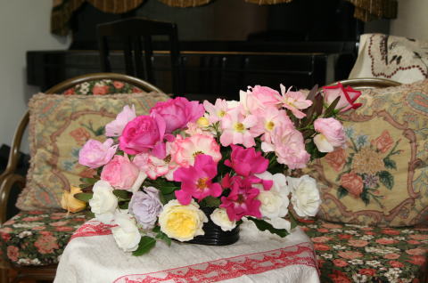 プレイガールがきれいに咲いていたのでピンク系を中心に生けてみました。イヴ・ピアジェがいい香りです。