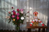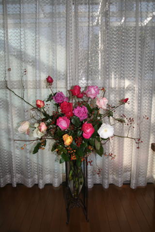 お正月用に切らずに咲かせておいたバラで新春アレンジメントです。今年もよろしくお願い致します。