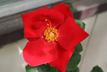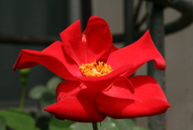 目が覚めるような真紅の花弁と黄色いしべの調和がおしゃれな一重咲きのバラです。