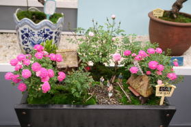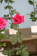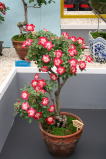 | こちらもお馴染み、跡見昭さんのバラの盆栽。右は「七人の侍」だそうです。 |