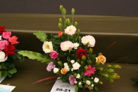 | アレンジメントの型のひとつ「ホガース」で、しっかりまとめた完璧な作品。これまで毎年この自由花アレンジメント部門で競い合ってきた愛知県の方の大賞受賞・・・自分のことのようにうれしかったです。 |
