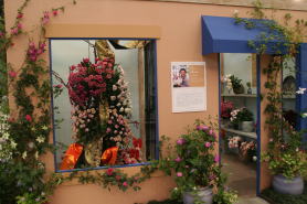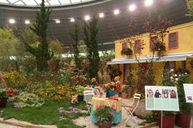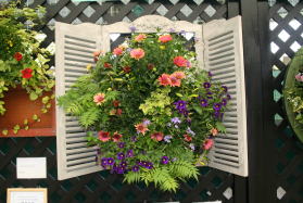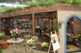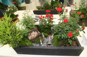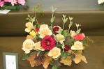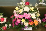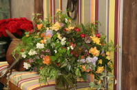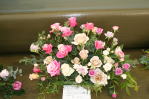 | 日当たりのよい玄関先で咲いたベティ・ブープ、エバンタイユ・ドール、マチルダ、ミニバラのよそおい、フランシス・デュプリュイ、ルイ14世、ザ・ピルグリム、プリンセス・オブ・ウエールズ、それに例年なら咲き終わっているつるバラのバタースコッチのアレンジメント。右の写真は完成間近の様子です。 |
