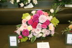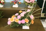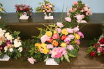 | 日曜日、しかも「無差別級」といわれる自由花アレンジメント部門だけあって、遠方からの出品も多く、29点の作品が出揃いました。(上段は昨日の花。昨日優秀賞を頂いたうちのマチルダたちも結果を見守っています。今日の作品はその左下です。) |