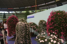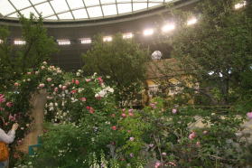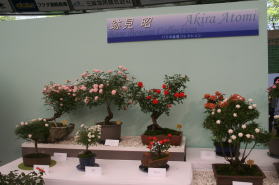 | 石井強さんのウイーピングスタンダード、跡見昭さんのバラの盆栽コーナーもすっかりおなじみ。素晴らしいの一言です。 |