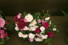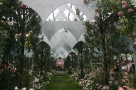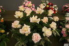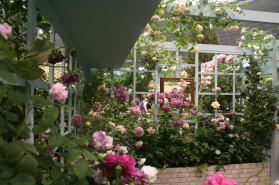 | ピエール・ドゥ・ロンサール、ブラン・ピエール・ドゥ・ロンサール、ザ・ピルグリムをメインに、グラミス・キャッスル、ソフィーズ・パーペチュアル、フェリシテ・パルマンティエ、ウイリアム・ロブなどをあしらってさわやかな雰囲気に仕上げてみました。他の出品者やギャラリーの方々に「きれいですね」と声をかけていただいてうれしかったです。 |
