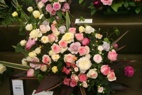 | 自由花アレンジメントは「無差別級アレンジ」とも言われ、HTからアンティーク調まで合計31点がずらりと並びました。今回はラベンダー・ピノキオをメインにしながら、エバンタイユ・ドールや花ぼんぼり、バタースコッチなどでシックに生けてみました。周りが色鮮やかな作品ばかりだったのでちょっと浮いた存在?? なお、今回から準優秀賞はなくなりました。 |