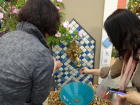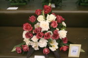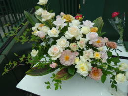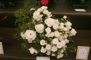 | 上の写真、左は生け込みを始めたところ。右がほぼ完成したところです。が、ここでハプニング。やなぎ妻がエントリー手続きをしている間にやなぎ夫がちょっと気になる花を発見・・・これがいけなかった。戻ってきたやなぎ妻が修正を始めたところ、ぎりぎりのバランスで活けられていたその部分が崩れだしてしまいました。悪戦苦闘の末、なんとか形になりましたが、前の方がよかった・・・余計な口出しをするものではありません。 |