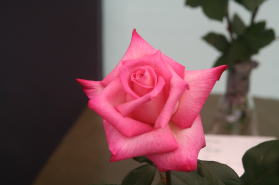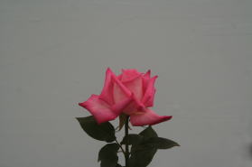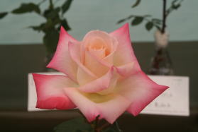 ジェミニというバラは日の当たり具合で赤色部分が相当違います。いまいち日当たりの悪い我が家の場合はこんな色になります。個人的にはこの色合いが大好きなのですが、どう評価されるのかかなり不安ではありました。花のすぐ下の一枚葉がばかデカいので優秀賞は出来すぎです。 |