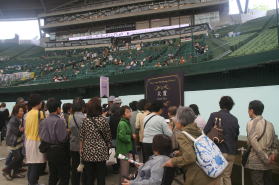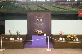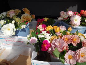 | 4時起きしてバラを切り、6時15分に家を出発。外環道で事故渋滞がありましたが、8時半過ぎに到着。左は西武ドームに到着して車のトランクを開けたところ。これを活け込み所に運ぶのが大仕事なのです。 |