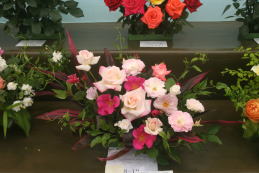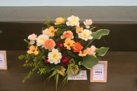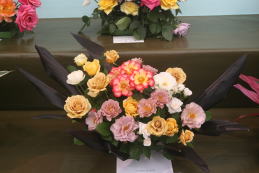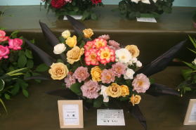 参加作品が出揃いました。今回、アレンジメントに使用するバラは20枝以内というルールのため、例年に比べてやや小さめの作品が並びましたが、どれも皆素晴らしい・・・自信喪失・・・。 |