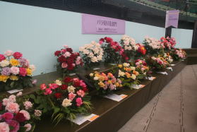 大輪一輪花、香りバラ同種二枝、房咲き三枝、自由花アレンジメントの4部門それぞれの最優秀賞作品が、グランプリ(大賞)を決める最終審査会場に運ばれました。