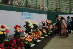 新幹線で来られ、8時半頃から締め切りの12時近くまで時間をかけて活けていらっしゃいました。おめでとうございます。 |