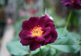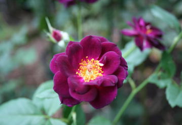 濃いベルベットパープルのシュラブ・ローズ。花もちはそれほどよくはありませんが、小振りの花が次々と咲きます。