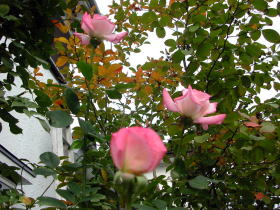 | ナツツバキも少しずつ黄葉してきました。 手前のバラはジェミニです。 |