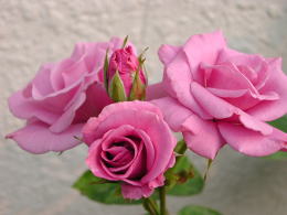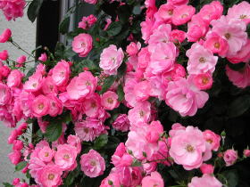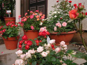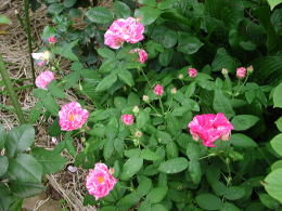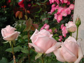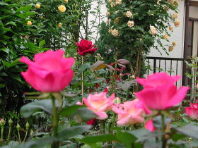 | 大輪系のバラが満開です 手前ローズピンクはノービー、その後ろが ダイアナ・プリンセス・オブ・ウエールズ、 さらの後ろの赤黒色がパパ・メイアン |