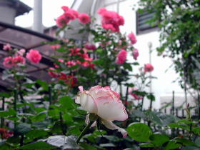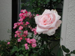 | 玄関脇のメルヘン・ケニギン(手前)の つるバラのアンジェラ |