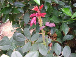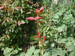 | 9月上旬に剪定した大輪咲きのバラたちも新芽が伸びてきました。 開花は10月下旬の予定。 |