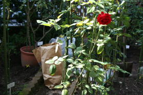| 品評会のあとは、バラの移植、咲きがら積み、落ち葉掃除、畑コーナーの草むしり、アンズの 剪定、薬剤散布(黒点・ウドンコ退治)・・・充実した一日でした。が、腰がやばいかも・・・。 |