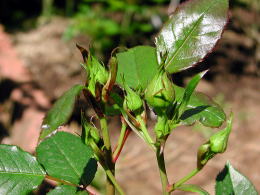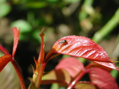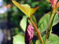 | バラゾウムシの被害が治まりません。新葉に薬害が出るのを恐れて薄い薬を散布しているせ いもあり、なかなかコロリといってくれません。バラゾウムシは蕾や葉の付け根に産卵し、刺さ れた所から先は右の写真のようにしおれて枯れてしまいます。 こうなったら現行犯逮捕しか ないのですが、小さい上に(体長3ミリ)すばしっこくてなかなか捕まりません。 左上の画像をクリックして、憎きヤツをよーく見てやってください。 休みの日ならこうしてパトロールできるのですが、平日はお手上げです。二、三日後に薬害 覚悟で濃い目の薬を撒くことにしました。 |