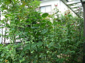 真夏は咲かせない方がバラも消耗しないし、お互いのためかもしれません。 |