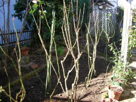 近年は温暖化のせいか冬になってもバラの葉が落ちません。光合成をしているのだから無理に落とさないほうが良いという意見もありますが、この先だらだらと落ちる葉をいちいち掃除すのは面倒なので「強制休眠させたほうが木が休まる」という都合の良い理論に賛成して葉はすべてむしり取りました。 |