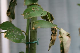 花や蕾だけ見ていればまずまず順調なのですが、このとおり葉はズタズタ。10月8日に襲来した台風18号の傷あとです。 |