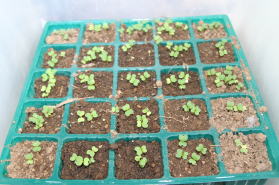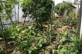 | 畑コーナーにはナス、トマト、キュウリを植えました。先週種を播いたレタスも発芽しました。 |