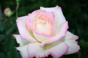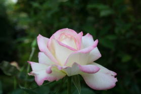 クリームホワイトにピンクの覆輪が入る上品な花色のバラ。