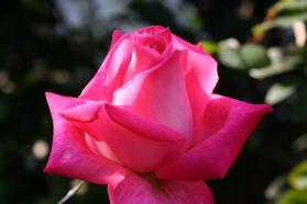 表は鮮やかなローズピンク、裏が薄ピンクの高芯剣弁。きりりと引き締まった花形が魅力的です。ピンクの花弁が時間の経過とともに次第に弁脈に白が差して退色して行き、その変化がまた美しい。