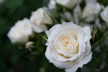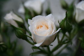 アイボリーホワイトの花型が整った上品なミニバラです。蕾が徐々に開いていく様子も美しい。
