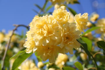 我が家のバラの中で一番はじめ4月下旬に咲くのがこの木香バラ。小さな八重咲きの、レモン色をした可愛らしいつるバラです。