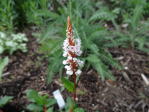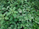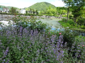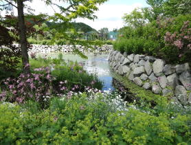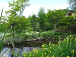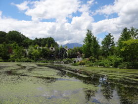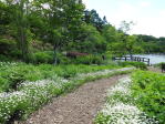 イングリッシュローズガーデンから石橋で湖の真ん中にある島に渡ります。様々な植物の葉のコントラストがきれいです。 |